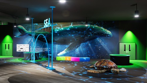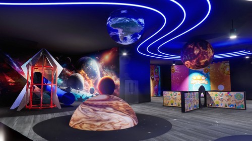 You arrive at church and start running to the giant aquarium. Kids are already playing and laughing around you. Neon lights glow nearby, illuminating planets and drawing you to a space-sized experience.